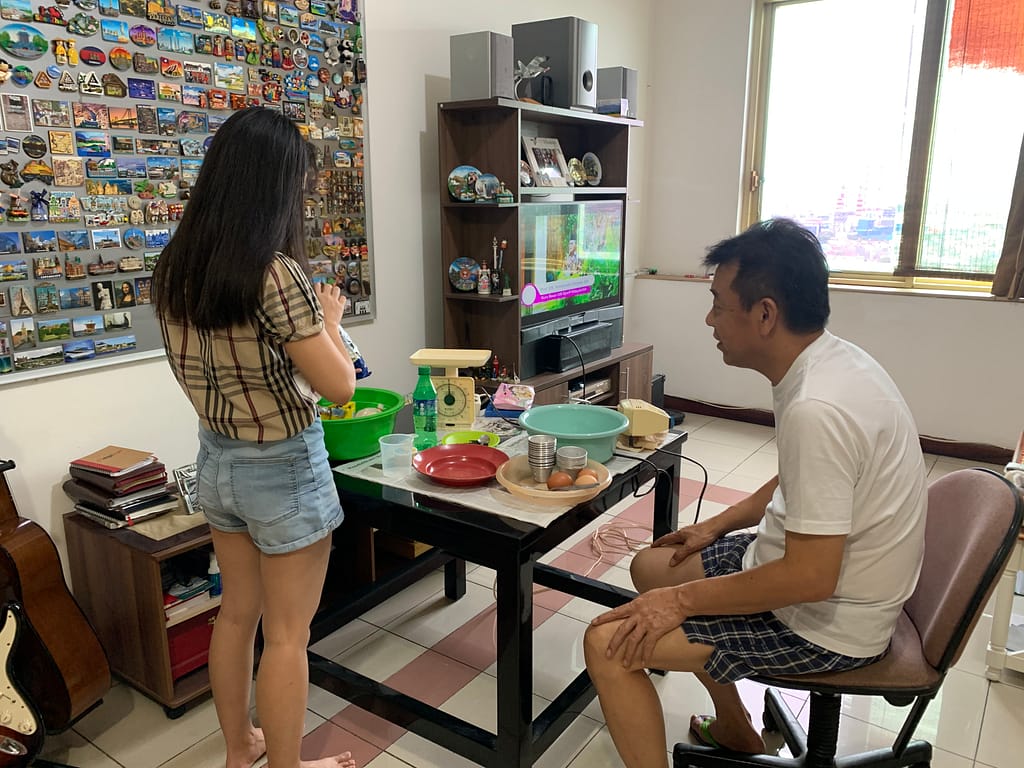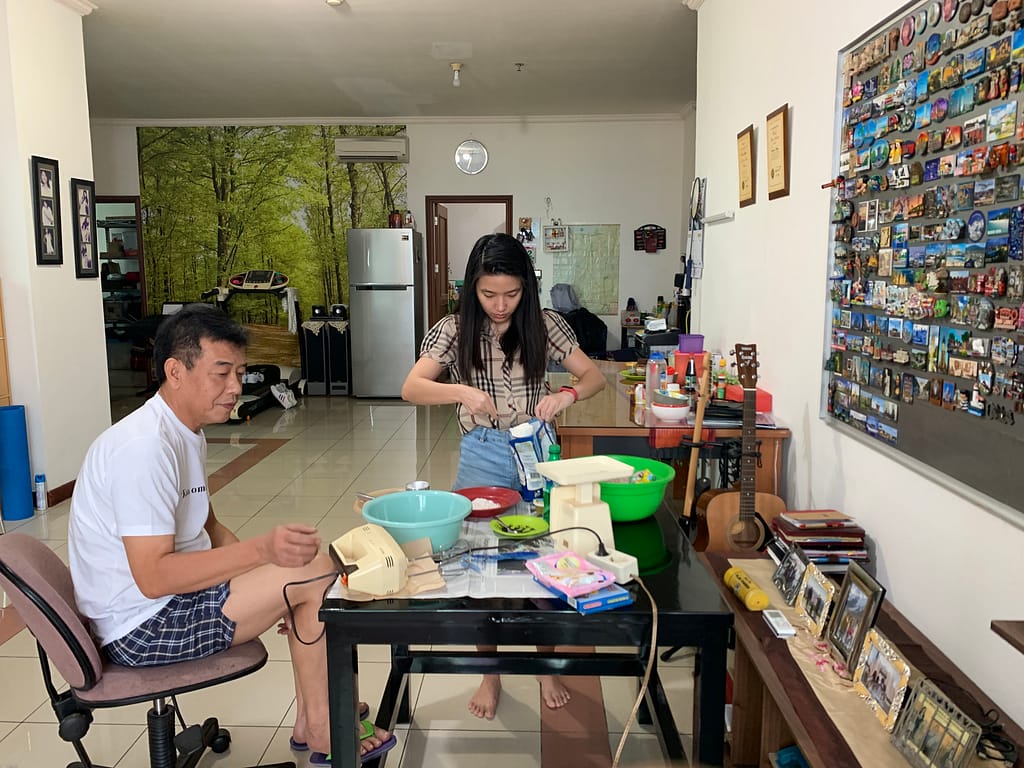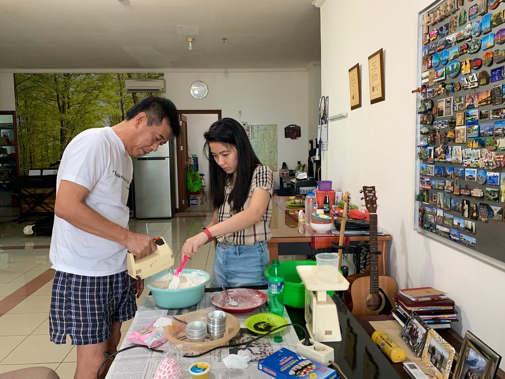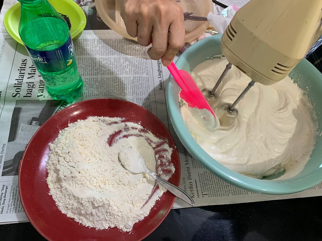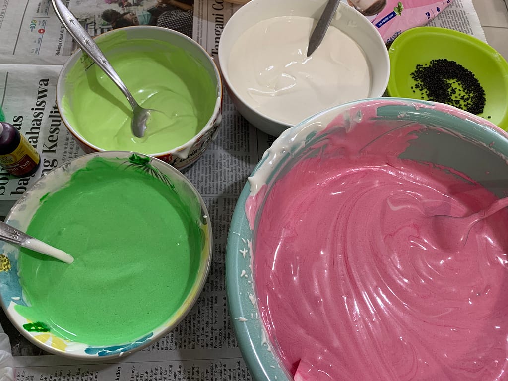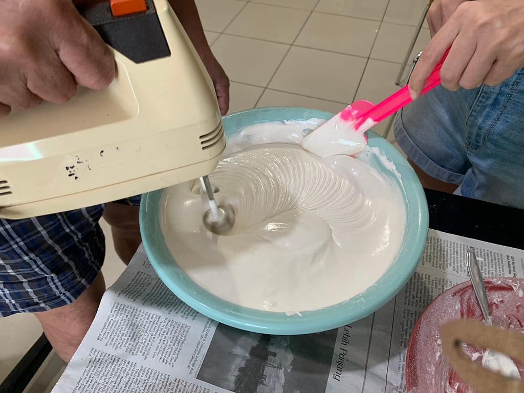 This time we made a steam sponge cake, my mom wanted to make it so it looks like a watermelon that means we need 4 colors, red / pink, white, green and lighter green. And in order to make it, it will be a little bit advanced pssst just a little bit because we use the mixer! haha finally we are using some tools. Since my dad is the son of a baker in our little village, he knows how to mix the ingredients well and this steam sponge cake recipe is already in his brain since forever.