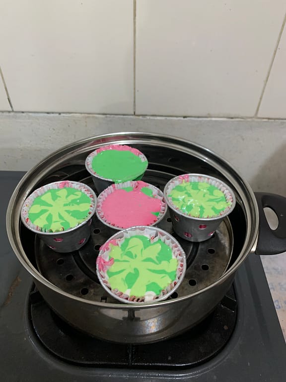 We separated it into 4 different colors then put it into a cup that will go to the steamer. We don’t really have the so called steamer, so we just use the pot that we already have and made it as a steamer.