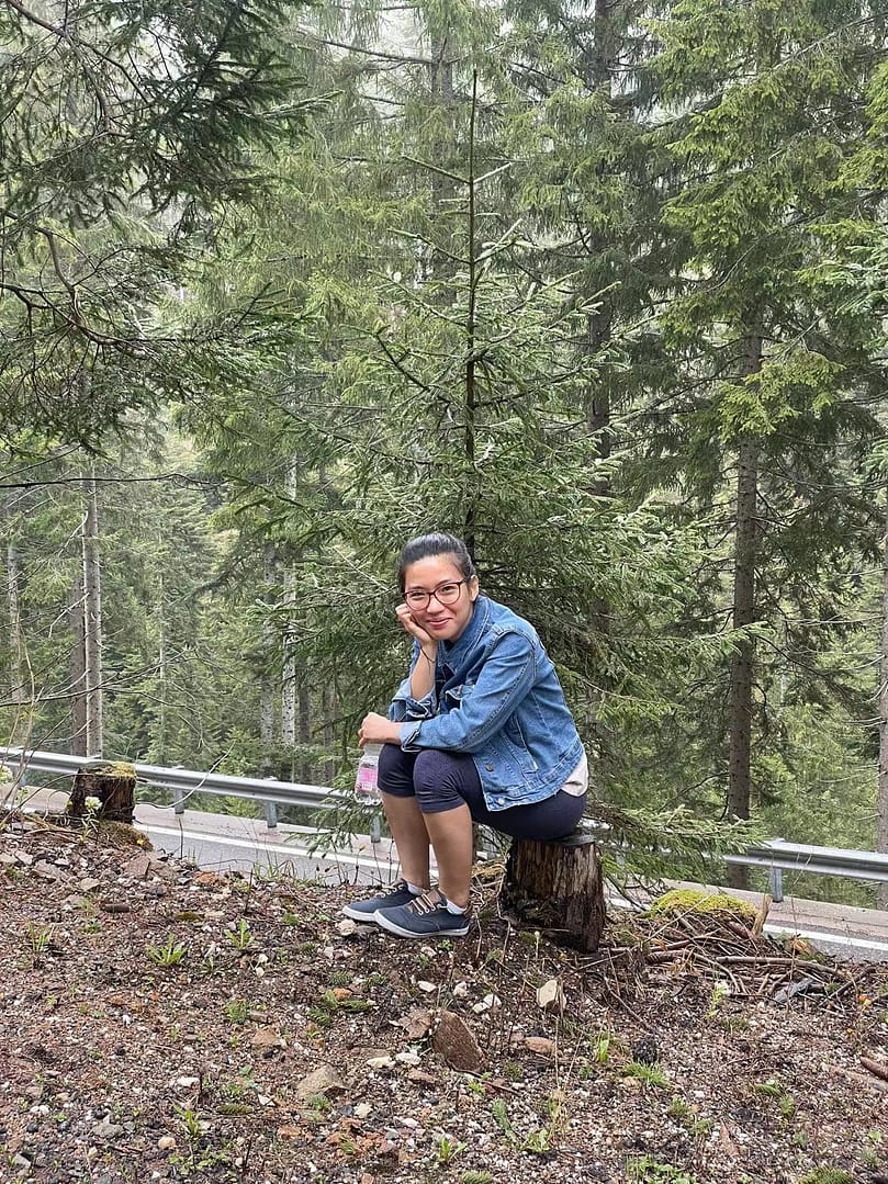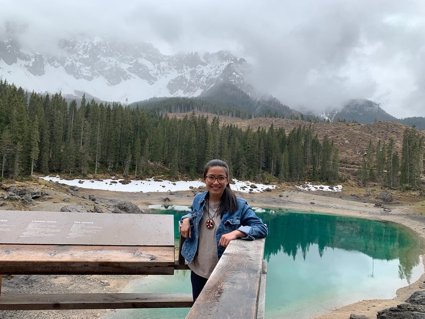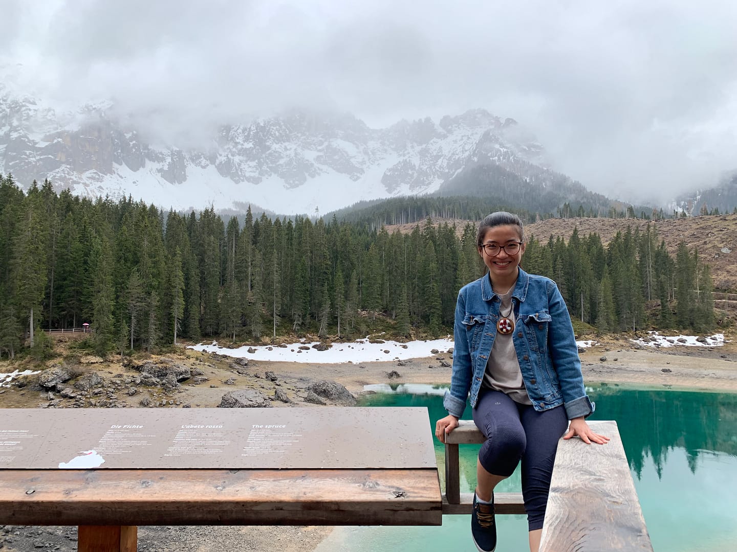 Driving duration from Eppan to Lake Carezza actually not so long, maybe within 1.5 hours supposedly haha 😉 it’s located about 1700m above the sea level. It is up in the mountain, actually it’s quite nice but my God the way up there was left, right, left, right, sometimes turn a bit sharp. Thomas honestly speaking drove very well, not fast, really smooth etc, we were talking talking talking then I started to feel something not comfortable in my stomach but I kept quiet, drink my water lalala until I broke the silence and he said “it is because of the road, not because you don’t eat enough breakfast or so, we can stop if you want” Oh yes I need to stop. I took a deep breath, stretching, sitting on top of the tree trunk, thinking should I continue to go or just go home because I really really want to throw up haha!