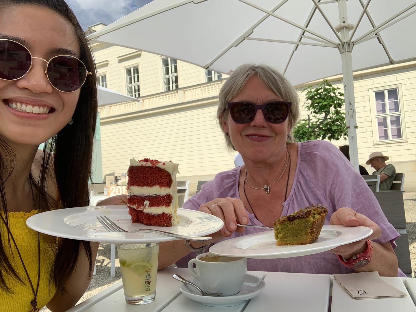 Ingrit said wir müssen unbedingt die große Fontane sehen, tadammm! reached it! We were sitting on the bench for a long time before we decided to move our asses and asked someone to take our pictures. Then she told me I need to see the Grotte? forgot the name but it’s some kind of mosaic artistic indoor place. Then we stopped by to re-fuel with cake! the birthday cake for my sister. The service was too slow and the waiter took a very ugly picture, not even wanted to say 1 2 3, pffff we left no tips!