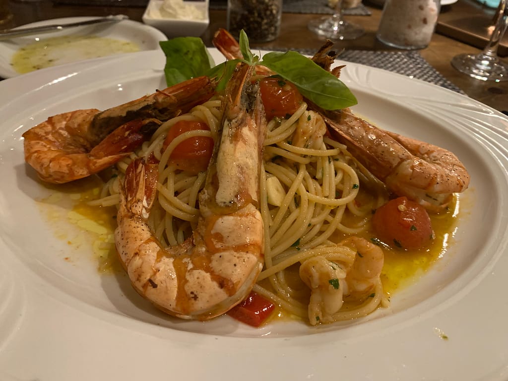 He brought the menu board, I don’t understand any of it! not that my German is not good, rather the menu was above my understanding level of Italian dishes, I was looking for an Aglio Olio as I really have Bock für Knoblauch at that day, nevertheless I saw nothing! Seems he sensed the confusion in me therefore asked “ist alles in Ordnung?” I was like “nein, alles ist far away from in Ordnung, warum hast du kein Aglio Olio?” Then he said, even though it is not in the menu, they can make it. Yeayyy!!!!