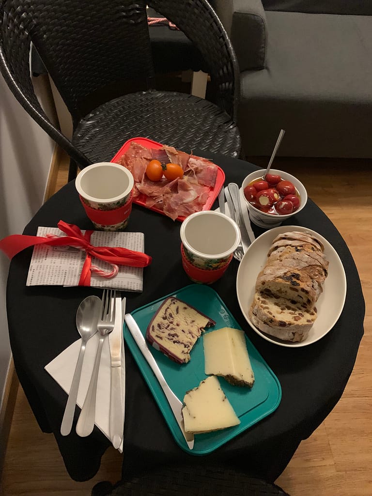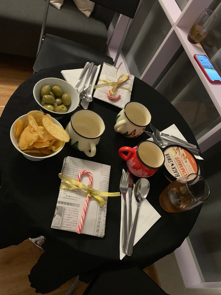 It was a rainy day on Christmas but I like it because I had the chance to wear my rainy boots for the first time ever! I arrived in front of their gate, I was clueless on how to ring a bell for sure I pressed the right number but the intercom didn’t want to call her room, I thought she heard my frustration and opened the door for me, when I arrived Tash was already there. I got welcomed by the very amazing blueberry cheese, bread, ham, chips, champagne and the gift! #thumbs up