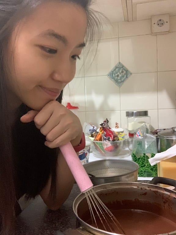 I really like when I had to mix the pot because after some time you can smell the smell? hee?? there is a scent or flavor or whatever it’s called and it’s soo yummy! And due to the natural color of the zebra, which is two so we need to make another one with the chocolate. Then we need to put it layer by layer so first is the white, next put the chocolate in the middle and keep going until it goes up.