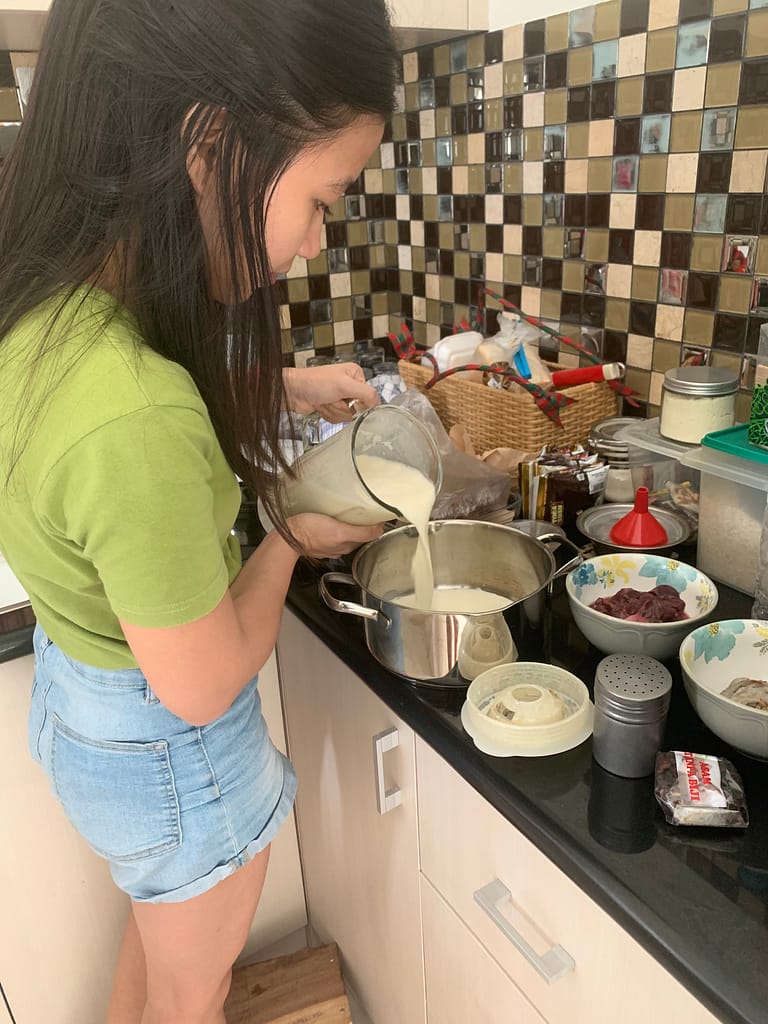 We separated it into 4 different colors then put it into a cup that will go to the steamer. We don’t really have the so called steamer, so we just use the pot that we already have and made it as a steamer.